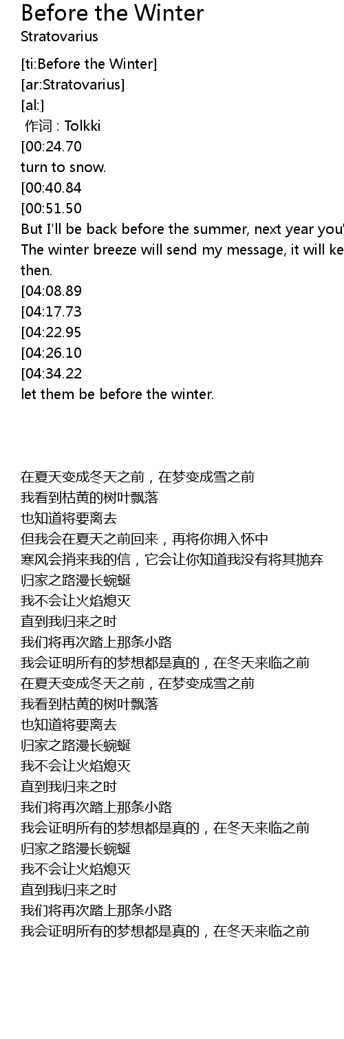 | [05:07.67][04:34.22][01:55.54] | I' ll show that all the dreams are true if you only let them be before the winter. |