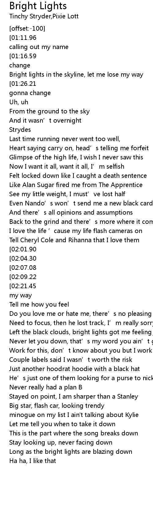 | [01:21.21][02:21.45][03:02.25] | Bright lights in the skyline won' t let me lose my way |