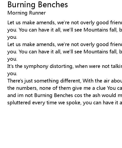 and im not Burning Benches cos the ash would make me choke It was me who always spluttered every time we spoke, you can have it all |
