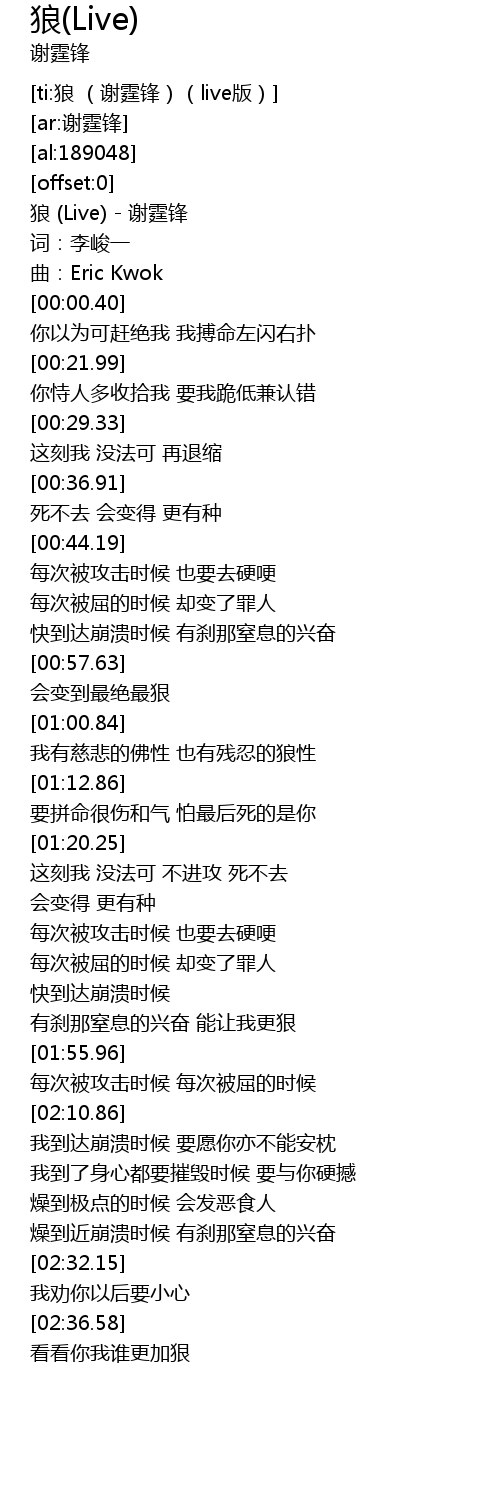 | [00:00.10] | 狼 (Live) - 谢霆锋 |