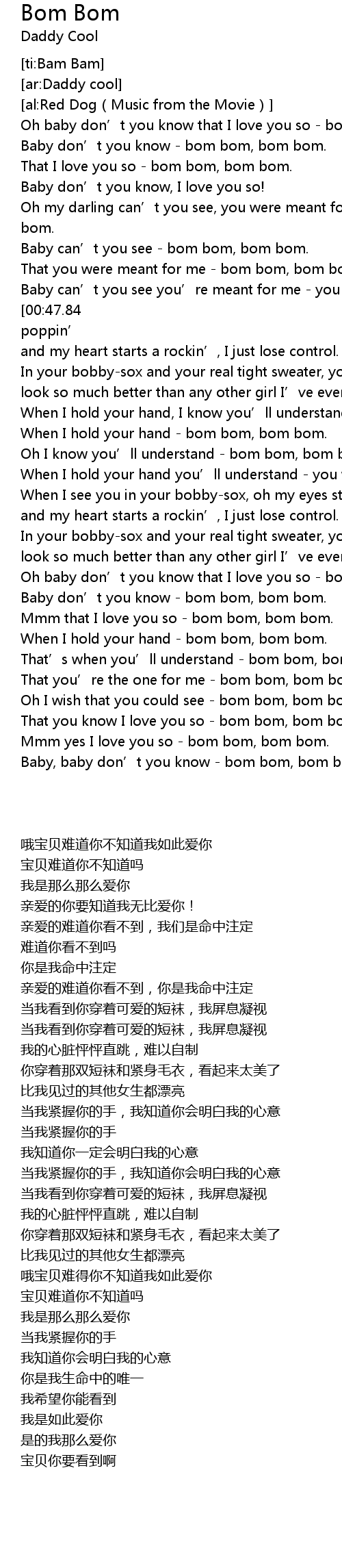 | [01:43.19] | Oh baby don' t you know that I love you so bom bom, bom bom. |