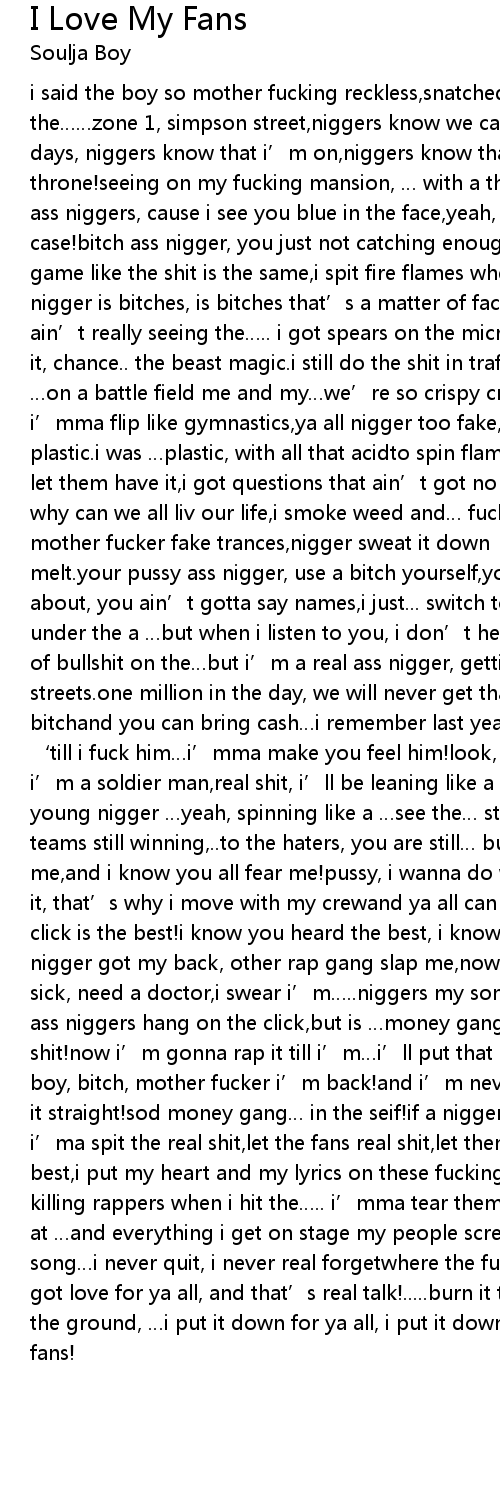 | i said the boy so mother fucking reckless,snatched the .. straight form the……zone 1, simpson street,niggers know we can get the beat!get it on these days, niggers know that i’m on,niggers know that i’m the king on my god damn throne!seeing on my fucking mansion, … with a thirty inch screen plasma.avatar ass niggers, cause i see you blue in the face,yeah, bitch i see you lose to the case!bitch ass nigger, you just not catching enough cocaine,it’s sod money, game like the shit is the same,i spit fire flames when i get to the track,you nigger is bitches, is bitches that’s a matter of fact!pussy, ya all niggers i ain’t really seeing the….. i got spears on the microphone,i let niggers have it, chance.. the beast magic.i still do the shit in traffic, an still let the …on a battle field me and my…we’re so crispy cream and we…uh, and i’mma flip like gymnastics,ya all nigger too fake, ya all remind me of plastic.i was …plastic, with all that acidto spin flame on the track, just to let them have it,i got questions that ain’t got no answers,i got …tell me why can we all liv our life,i smoke weed and… fuck your wife, nigger!i hate mother fucker fake trances,nigger sweat it down ‘till this shit gonna melt.your pussy ass nigger, use a bitch yourself,you know who i’m gonna talk about, you ain’t gotta say names,i just... switch too lame.i just hit a blonde under the a …but when i listen to you, i don’t hear no…all i hear is a lot of bullshit on the…but i’m a real ass nigger, getting here in these streets.one million in the day, we will never get that,i make history look bitchand you can bring cash…i remember last year..but i’m ..with the fears, ‘till i fuck him…i’mma make you feel him!look, my name is soldier boy, but i’m a soldier man,real shit, i’ll be leaning like a kick stand….and my young nigger …yeah, spinning like a …see the… still spinning,see the sod teams still winning,..to the haters, you are still… but i know you all hear me,and i know you all fear me!pussy, i wanna do what i do,and if i do what i do it, that’s why i move with my crewand ya all can move… i move…i swear my click is the best!i know you heard the best, i know …i was moving so…real nigger got my back, other rap gang slap me,now my shit is all proper, i’m so sick, need a doctor,i swear i’m…..niggers my sons, i don’t need…pussy ass niggers hang on the click,but is …money gang, that’s so mother fucker shit!now i’m gonna rap it till i’m…i’ll put that shit on…..soldier boy, bitch, mother fucker i’m back!and i’m never …nigger, i just gotta get it straight!sod money gang… in the seif!if a nigger won’t… i might …but i’ma spit the real shit,let the fans real shit,let them decide who’s the best,i put my heart and my lyrics on these fucking tracks.now i’mma start killing rappers when i hit the….. i’mma tear them apart, and now my cars is at …and everything i get on stage my people screaming my name,my worst song…i never quit, i never real forgetwhere the fuck i came from, …day 1, i got love for ya all, and that’s real talk!.....burn it to you cd, ..i’m on the ground, …i put it down for ya all, i put it down for ya all,i love all my fans! |