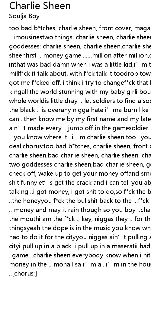 | too bad b*tches, charlie sheen, front cover, magazinespull it out ..limousinestwo things: charlie sheen, charlie sheen,charlie sheen,two goddesses: charlie sheen, charlie sheen,charlie sheen,two bad b*tches: charlie sheenfirst .. money game ......million after million,oh my god, i’m getting’ inthat was bad damn when i was a little kid,i’m twenty one now i’m like 21 millf*ck it talk about, with f*ck talk it toodrop town .. money at the roofyou got me f*cked off, i think i try to changef*ck that b*tch i think i f*ck a kingall the world stunning with my baby girli bought her pearls, she .. on the whole worldis little dray .. let soldiers to find a sodlgi’ve told you i found the black .. is overany nigga hate i’ma burn like ..yeah you’re ready you can ..then know me by my first name and my late namemister make it f*ck aroundi ain’t made every .. jump off in the gamesoldier boy ...i’m .. f*ck you nigga .. you know where it ..i’m charlie sheen too.. you know what the deal.chorus:too bad b*tches, charlie sheen, front cover, magazinesgoddesses: charlie sheen,bad charlie sheen, charlie sheen, charlie sheen,bad charlie sheen, two goddesses charlie sheen,bad charlie sheen, get your acted coveror get you check off, wake up to get your money offand smoke the rest of the money in the shit funnylet’s get the crack and i can tell you about some real shiti’m talking ..i got money, i got shit to do,so f*ck the bullshit you ain’t talking ..the honeyyou f*ck the bullshit back to the ...f*ck the whole game..up when i .. money and may it rain though so you boy ..charlie sheen i ain’t pull it on the mouthi am the f*ck .. key, niggas they .. for the music they’ve some thingsyeah the dope is in the music you know what i meanthe dray i came harder i had to do it for the cityyou niggas ain’t pulling all that .. put on ..the cityi pull up in a black..i pull up in a maseratii had to do my thing ‘cause i ..game ..charlie sheen everybody know when i hit the ..b*tches touch the flow, money in the .. mona lisa i’m a ..i’m in the house so the killa killa ..[chorus:] |
