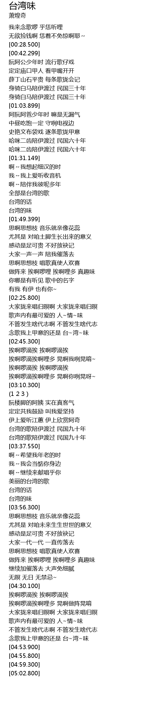 | [04:50.0] | 念歌我上甲意的还是 台~湾~味 |