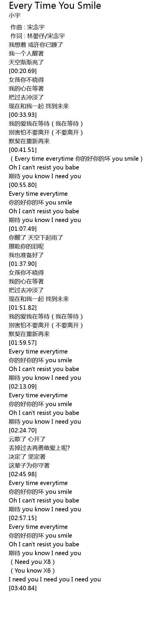 | [00:44.69] | Every time everytime ni de hao ni de huai you smile |
