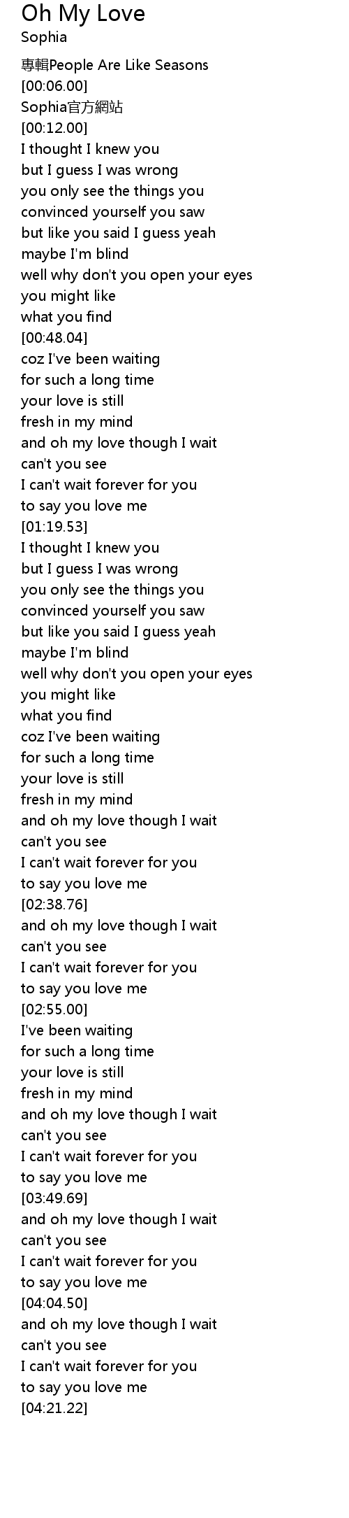 | [04:06.75] | and oh my love though I wait |