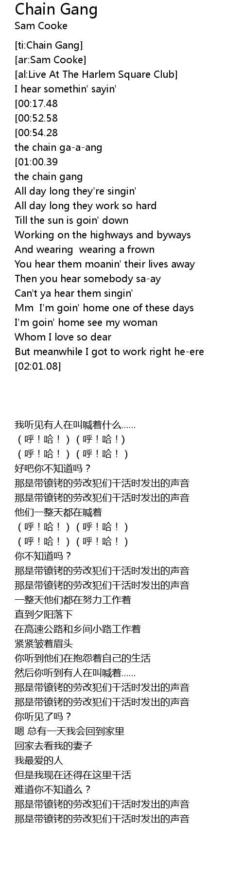 | [00:32.22][01:00.39][01:32.79][02:07.28] | That' s the sound of the men working on the chain gang |