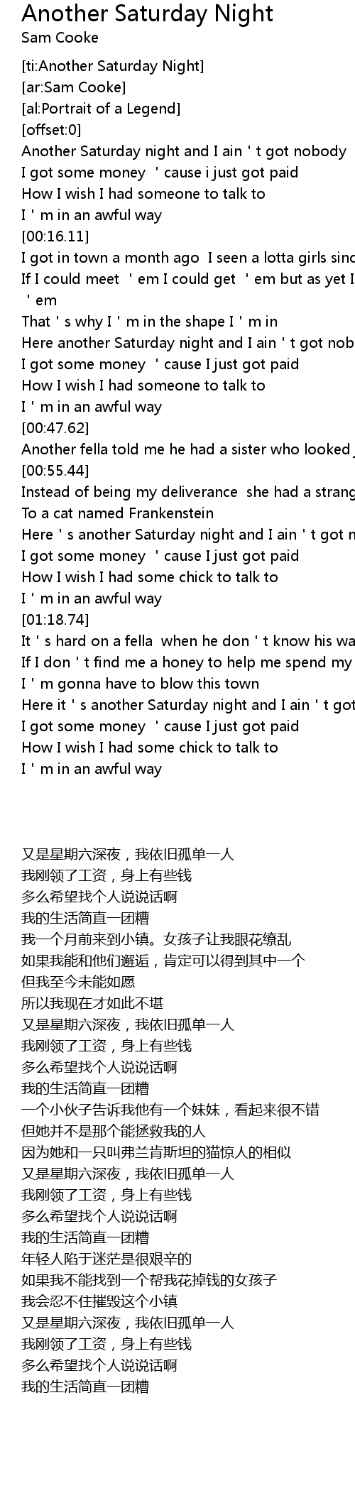 | [00:01.43] | Another Saturday night and I ain't got nobody |