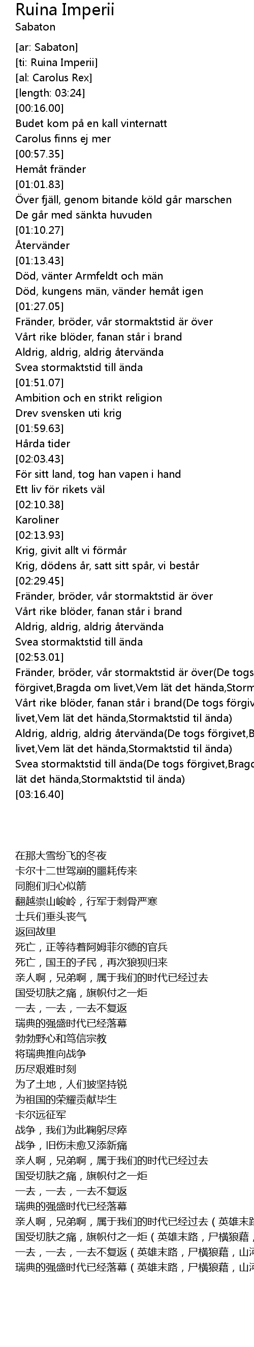 | [02:59.52] | Vårt rike blöder, fanan står i brand(De togs förgivet,Bragda om livet,Vem lät det hända,Stormaktstid til ända) |