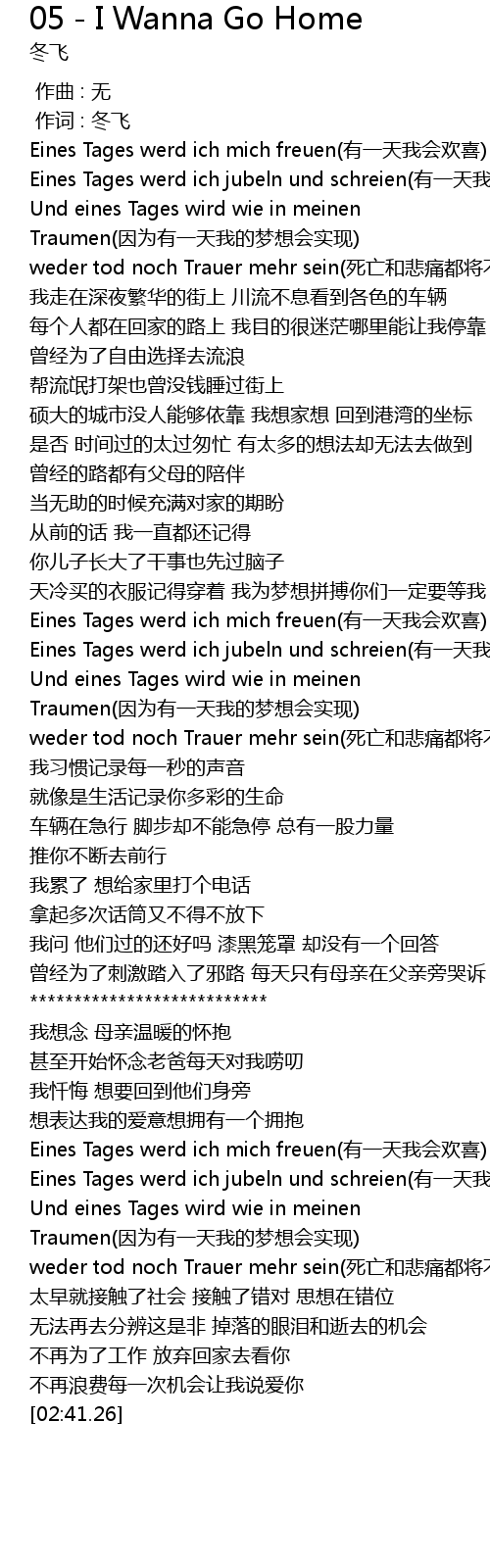 | [02:01.40] | Eines Tages werd ich mich freuen yǒu yì tiān wǒ huì huān xǐ |