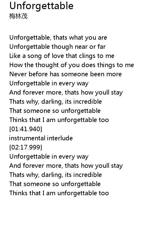 | [00:11.39] | Unforgettable, thats what you are |
