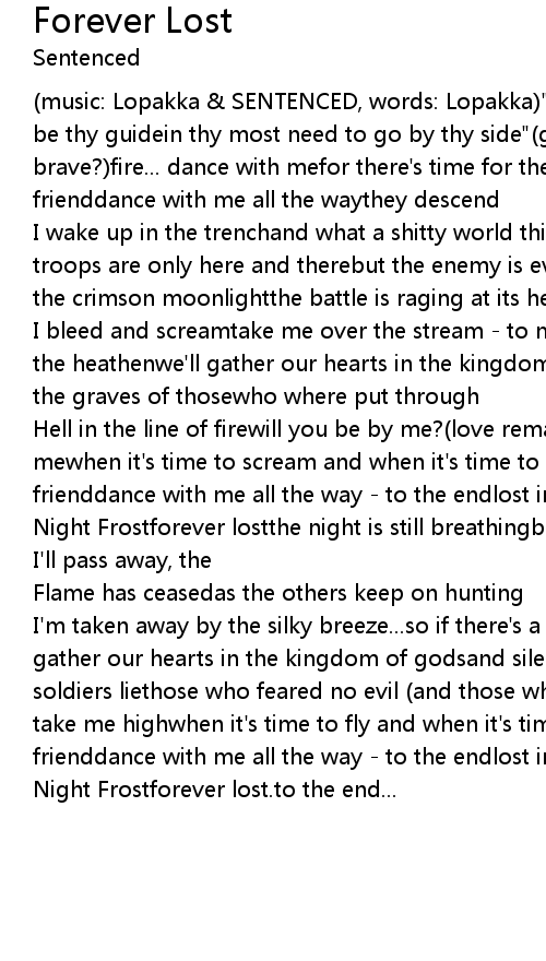(music: Lopakka & SENTENCED, words: Lopakka)"EVERYMAN, I will go with thee and be thy guidein thy most need to go by thy side"(grave - home of the brave?)fire... dance with mefor there's time for theedesire... rise, my frienddance with me all the waythey descend |