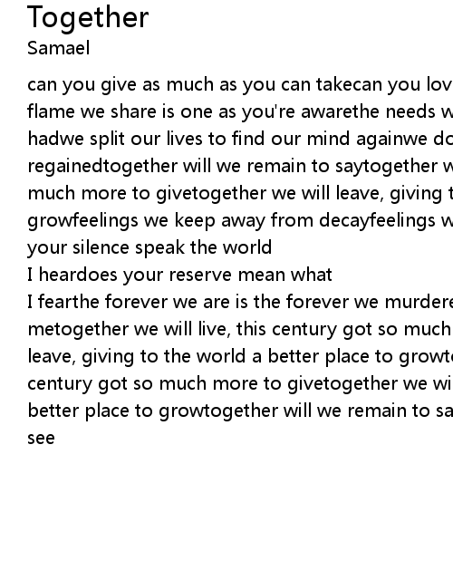 | can you give as much as you can takecan you love as much as you can hatethe flame we share is one as you're awarethe needs we burn is the child we never hadwe split our lives to find our mind againwe do divorce so our first fight's regainedtogether will we remain to saytogether we will live, this century got so much more to givetogether we will leave, giving to the world a better place to growfeelings we keep away from decayfeelings we send each other everydaydoes your silence speak the world | |