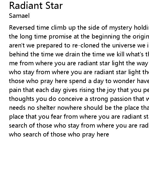 | Reversed time climb up the side of mystery holding tight the key to nowhereland the long time promise at the beginning the origin aren't we supposed to be bound aren't we prepared to re-cloned the universe we imagine the memory we left behind the time we drain the time we kill what's the need for a better life tell me from where you are radiant star light the way of those who search of those who stay from where you are radiant star light the way of those who search of those who pray here spend a day to wonder have a night to remember beyond the pain that each day gives rising the joy that you perceive through blurry thoughts you do conceive a strong passion that won't deceive the force you own needs no shelter nowhere should be the place that you fear nowhere should be the place that you fear from where you are radiant star light the way of those who search of those who stay from where you are radiant star light the way of those who search of those who pray here |