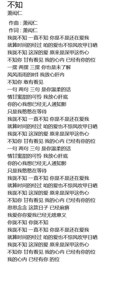 | [01:48.38] | 我拢不知 一直不知 你是不是还在爱我 |