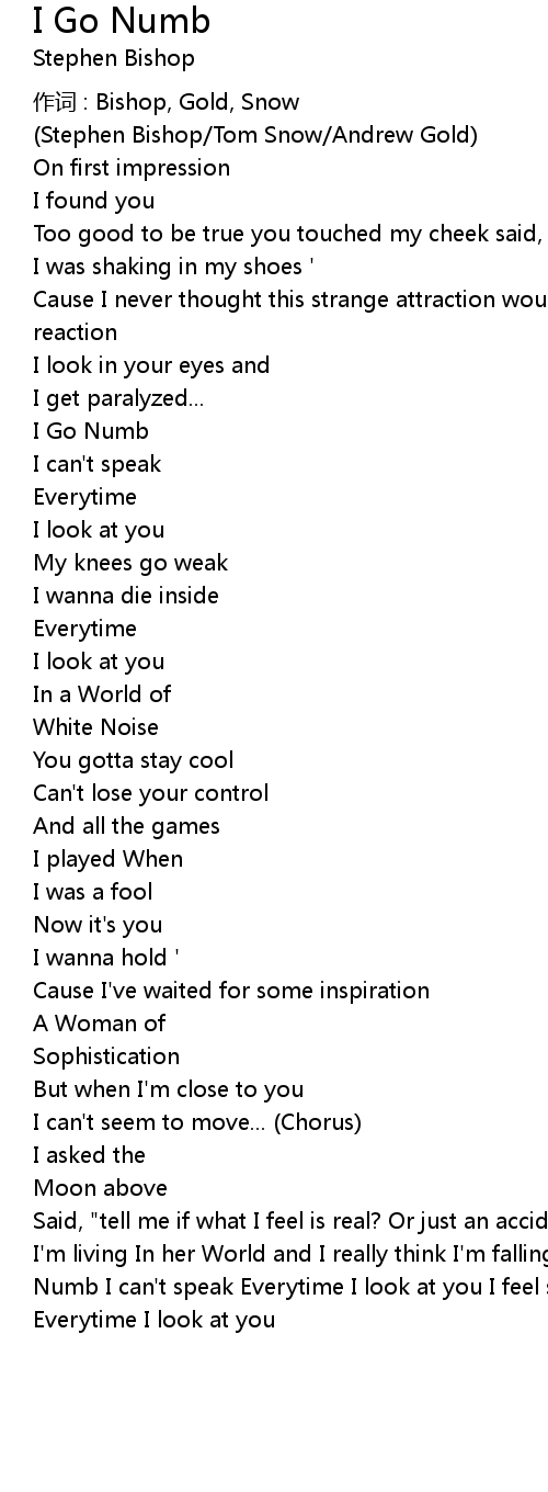 | Said, "tell me if what I feel is real? Or just an accident of love 'Cause now I'm living In her World and I really think I'm falling for this girl... I Go Numb I can't speak Everytime I look at you I feel so weak I wanna die Inside Everytime I look at you |