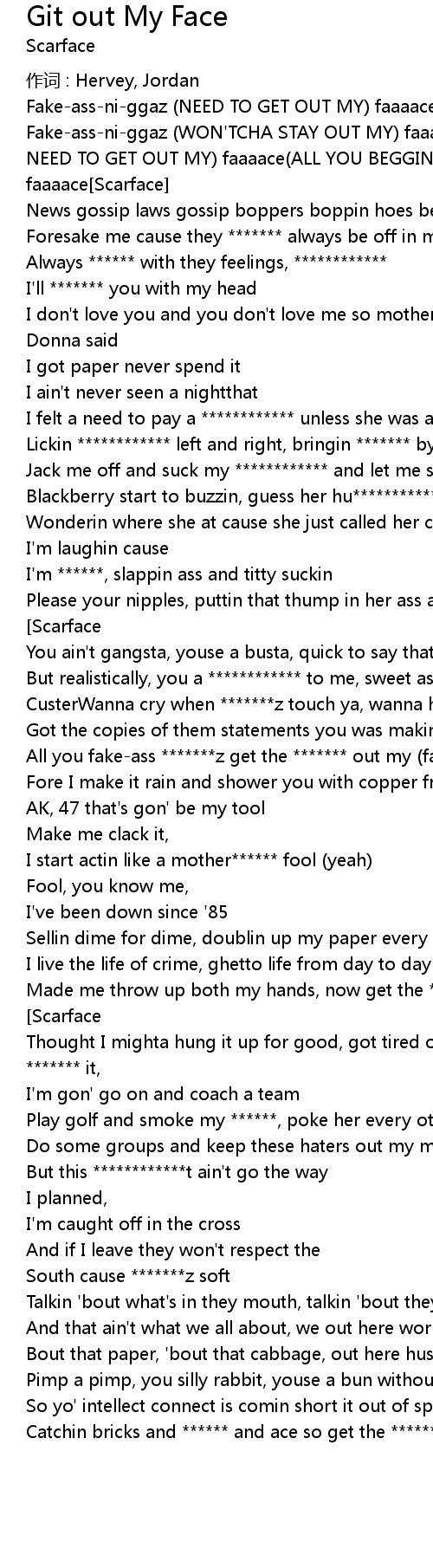 | Fakeassniggaz WON' TCHA STAY OUT MY faaaace ALL YOU FRAUDULENTASS Z NEED TO GET OUT MY faaaace ALL YOU BEGGINASS NEED TO GET OUT MY faaaace Scarface | |