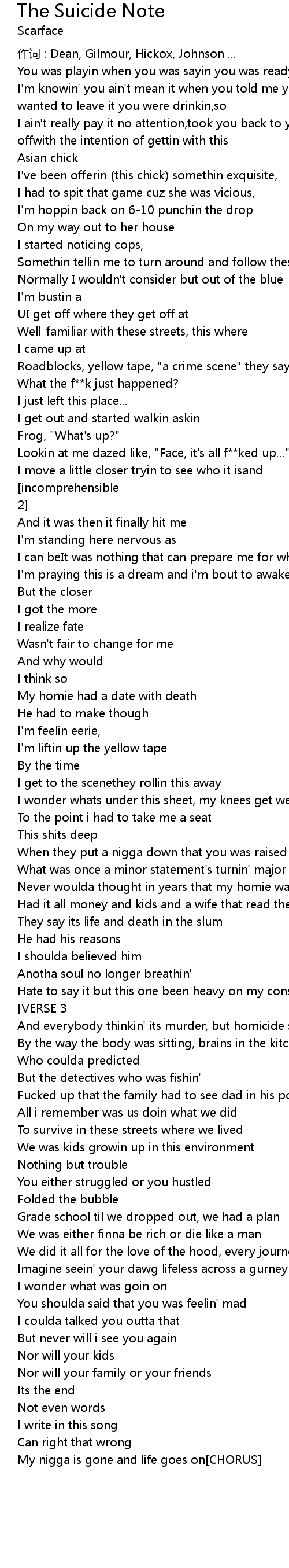 | I saw his baby mama in tears holdin his kids... CHORUS incomprehensible VERSE 2 | |