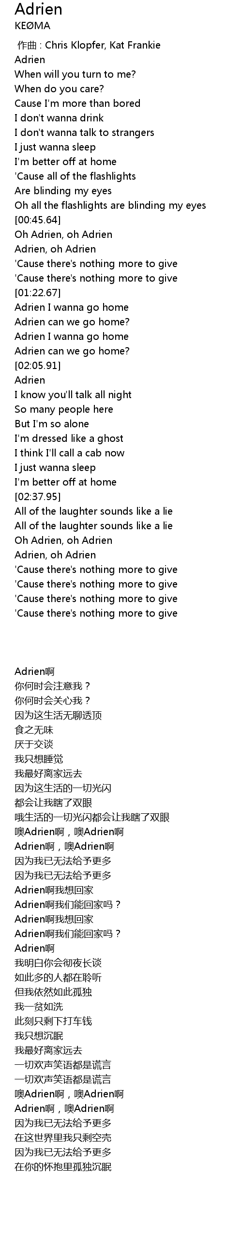 | [02:00.05] | Adrien can we go home? |