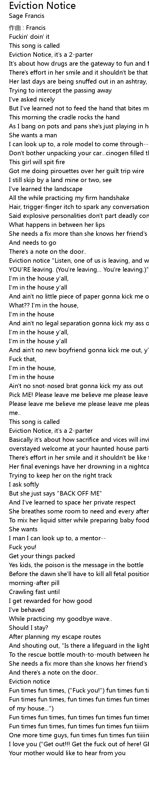 | Eviction notice " Listen, one of us is leaving, and when I say US I mean YOU... YOU' RE leaving. You' re leaving... You' re leaving." | |