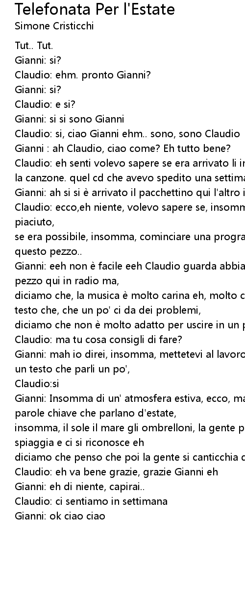 | [00:51.300] | Gianni: Insomma di un' atmosfera estiva, ecco, magari che ci son parole chiave che parlano d' estate, |