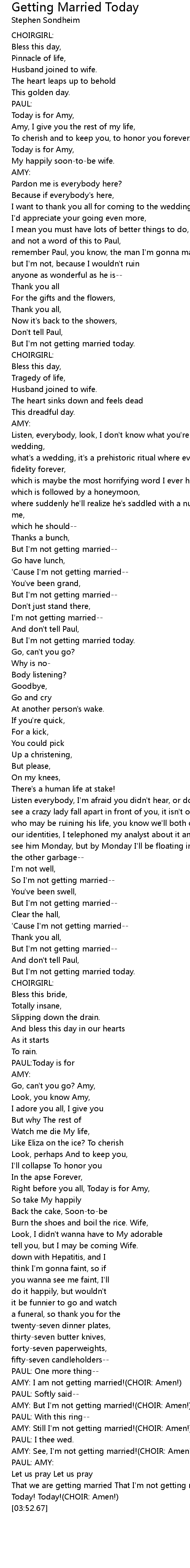 AMY: But I'm not getting married!(CHOIR: Amen!) |