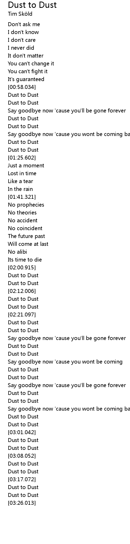 | [03:13.101] | Dust to Dust |