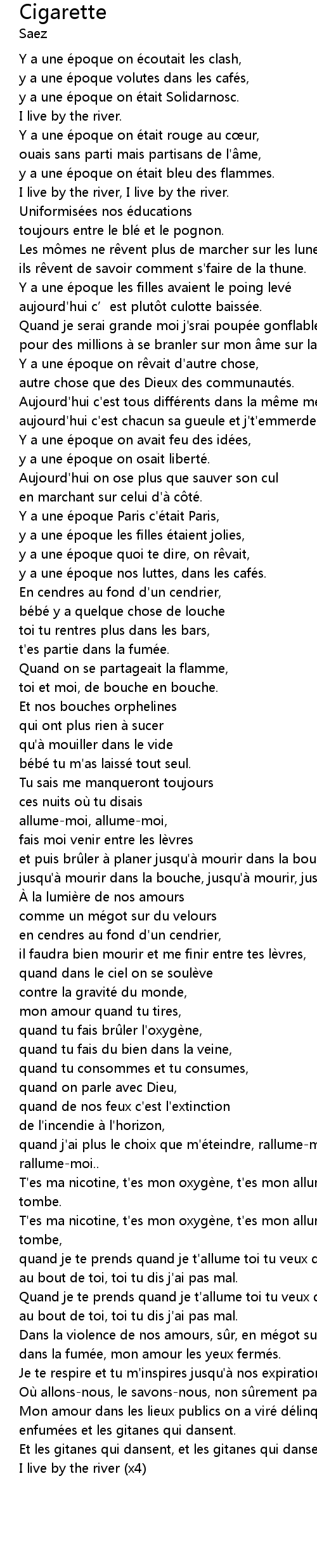 | T' es ma nicotine, t' es mon oxyge ne, t' es mon allumeuse, quand tu creuses ma tombe. | |