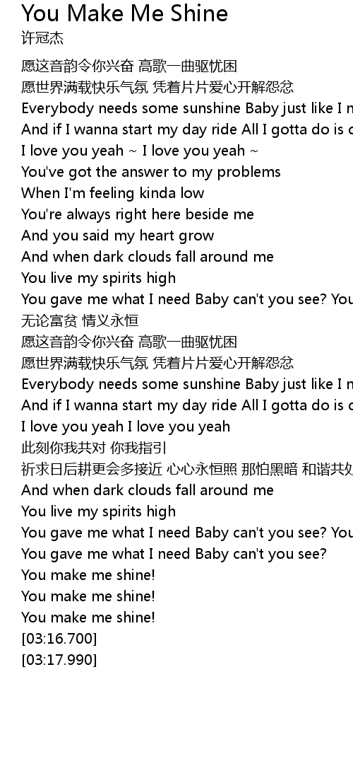 | [01:18.779] | You gave me what I need Baby can't you see? You make me shine! |