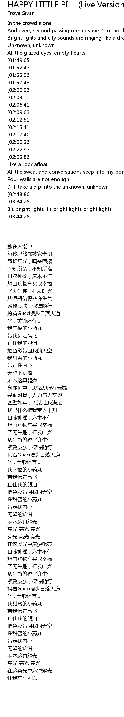 | [00:53.04][02:06.41][03:09.24] | My happy little pill |