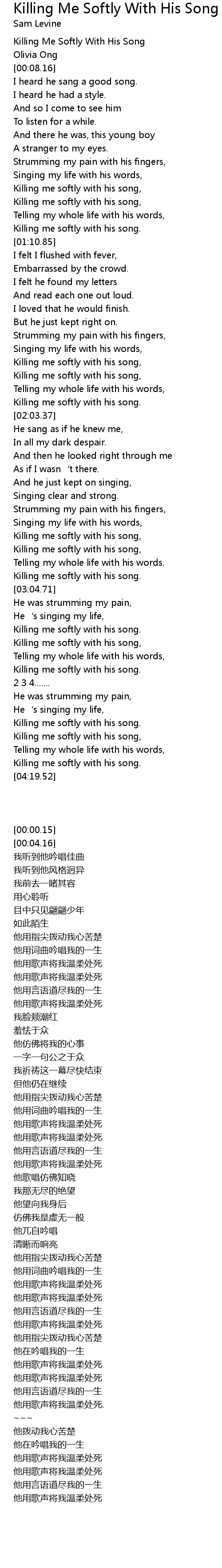 | [00:00.15] | Killing Me Softly With His Song |