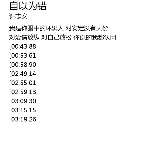 | [03:29.39][02:49.14][01:05.14] | 我总自以为错 总是自以为错 |