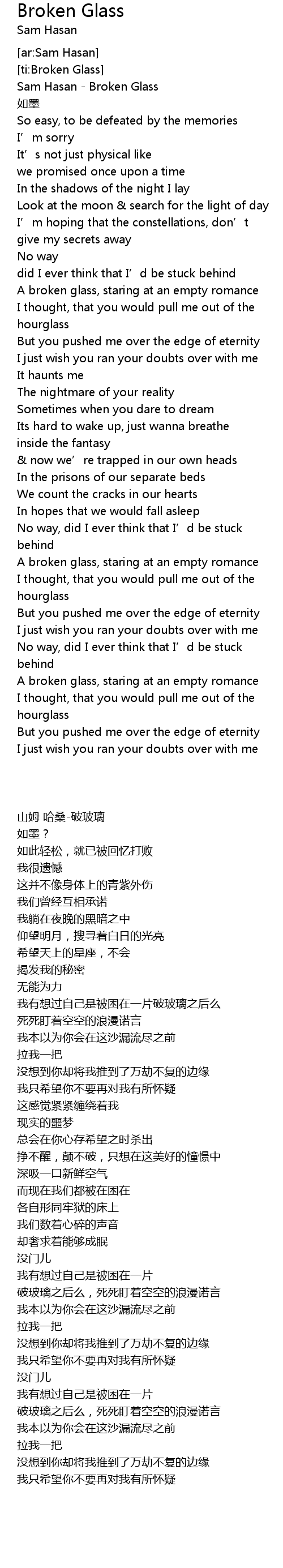 | [02:21.33] | A broken glass, staring at an empty romance |