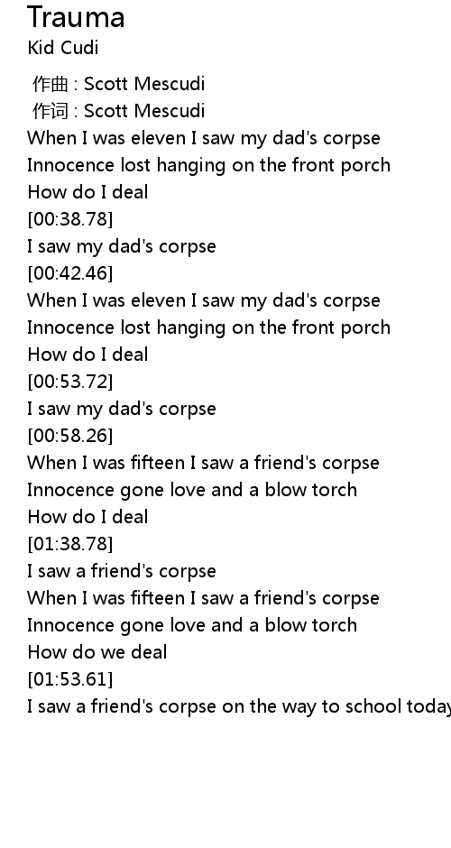 | [00:45.31] | When I was eleven I saw my dad's corpse |