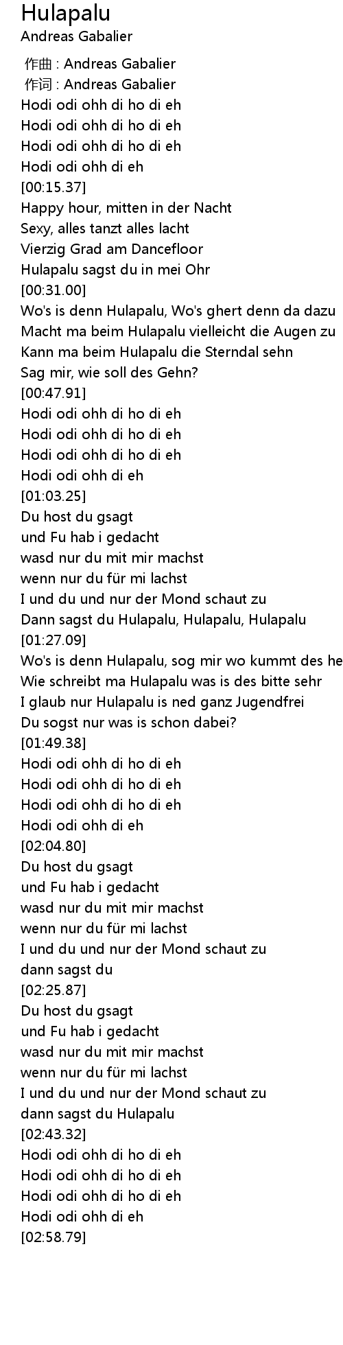 | [01:15.32] | Dann sagst du Hulapalu, Hulapalu, Hulapalu |