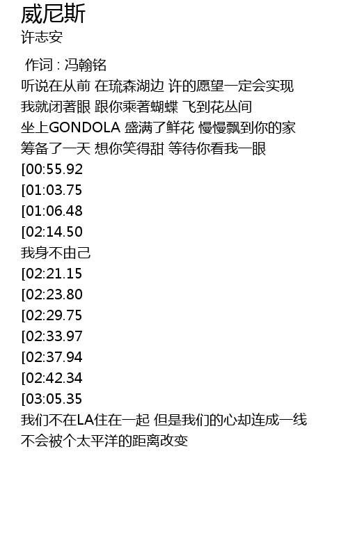 | [02:09.67][01:06.48] | 在那一瞬间 飞到威尼斯海边 |