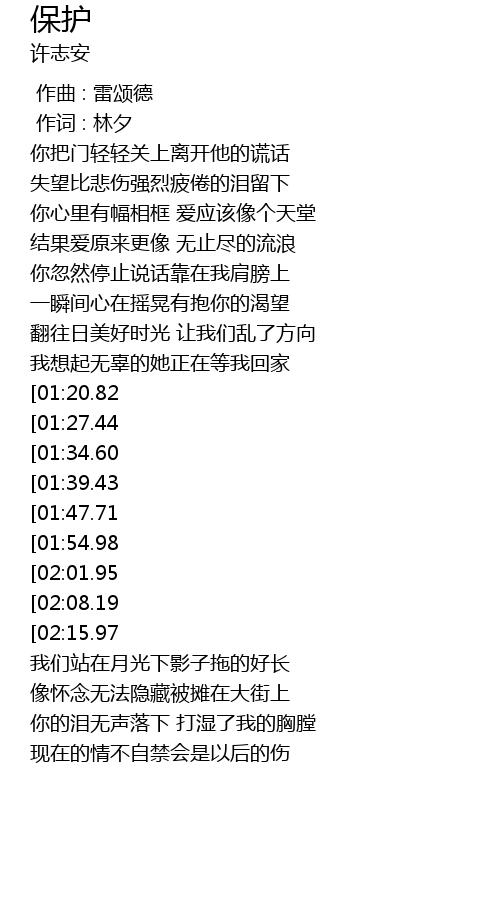 | [03:59.16][02:08.19] | 我只能 这样保护你 请你原谅 |