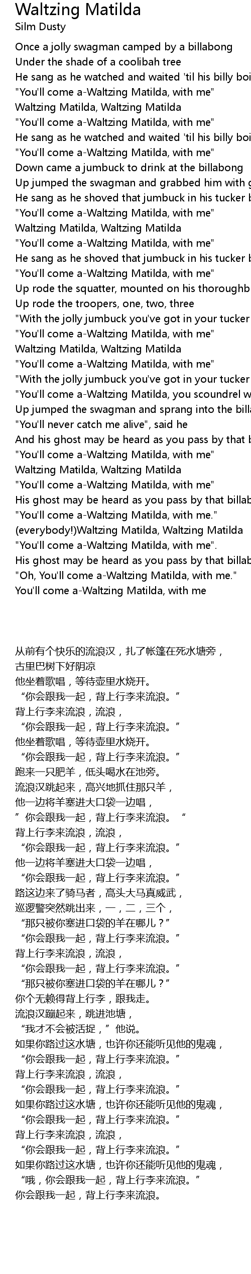 "You'll come a-Waltzing Matilda, with me". |