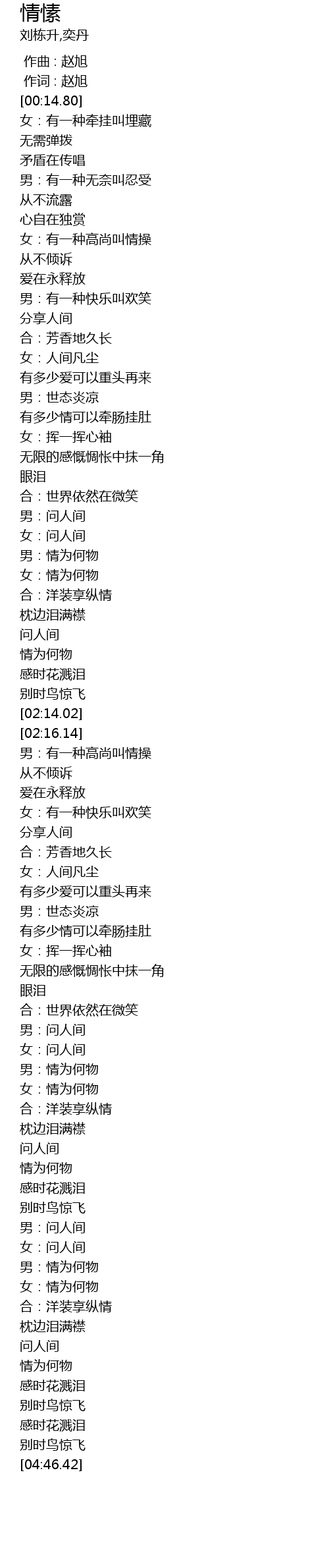 | [04:14.25] | 女:情为何物 |