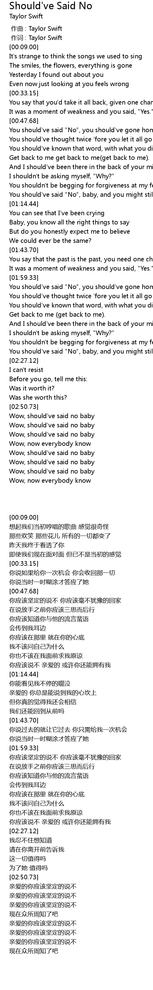 | [02:21.46] | You should' ve said " No", baby, and you might still have me |