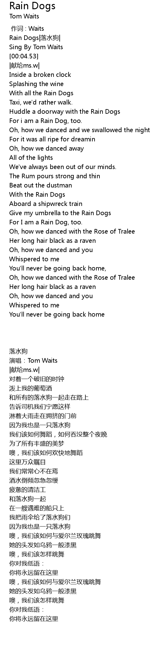 | [00:00.97] | Rain Dogs luò shuǐ gǒu |