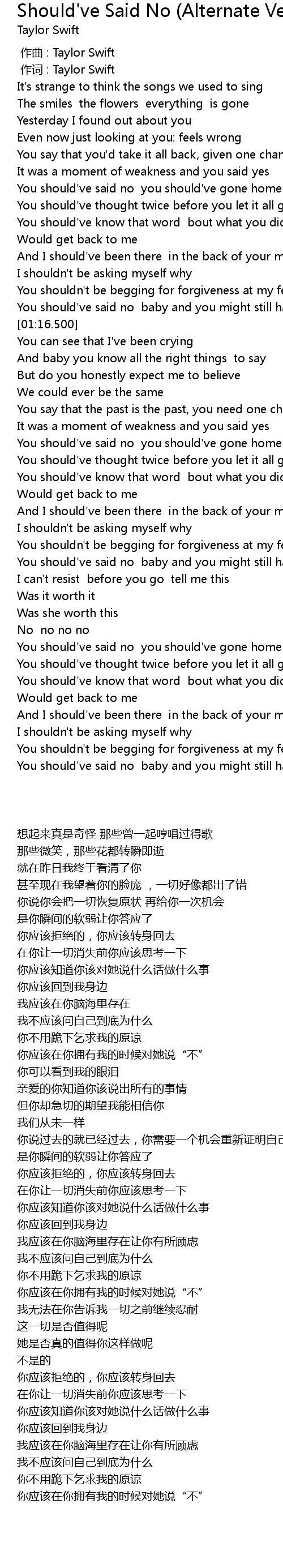 | [01:11.800] | You should' ve said no baby and you might still have me |
