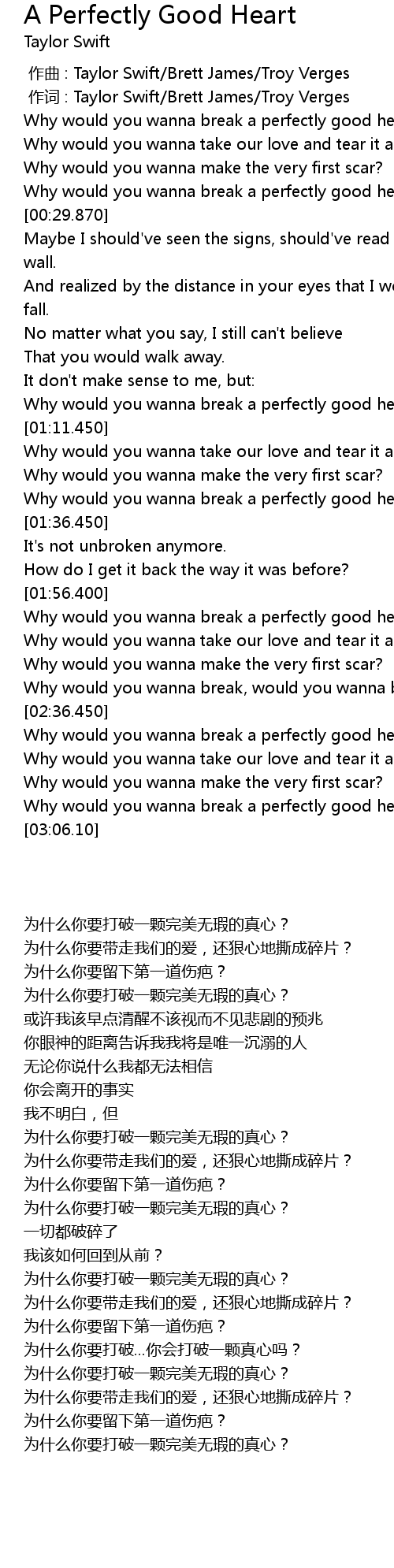 | [00:01.00] | 作词 : Taylor Swift/Brett James/Troy Verges |