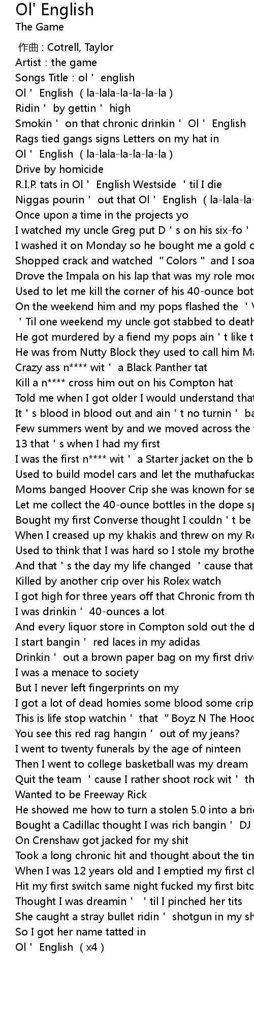 | [00:29.70] | Niggas pourin out that Ol English lalalalalalala |