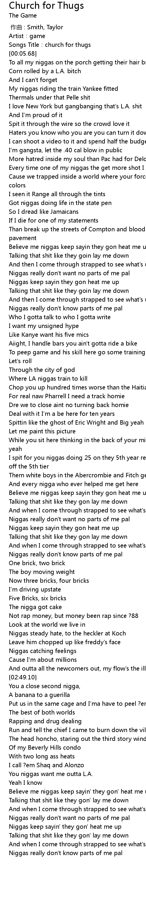 | [00:01.97] | Songs Title: church for thugs |
