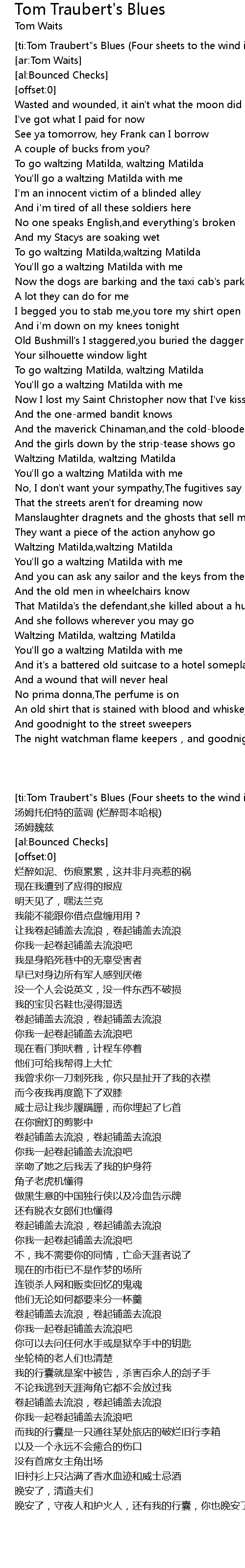 | [ti:Tom Traubert"s Blues (Four sheets to the wind in Copenhagen)] | |