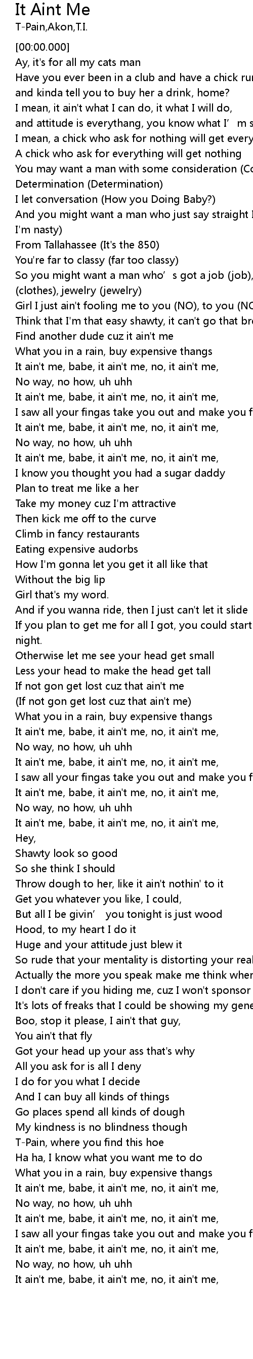 | [00:59.120] | Find another dude cuz it ain' t me |