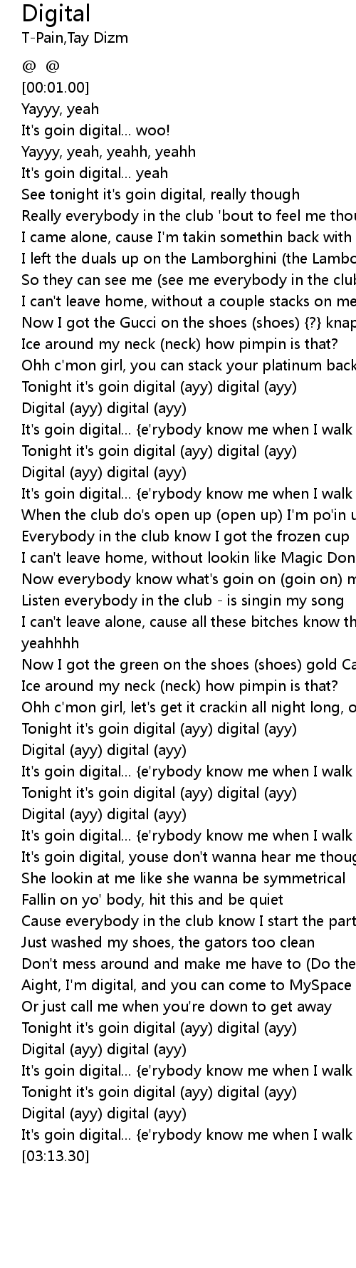 | [00:59.22] | Tonight it's goin digital (ayy) digital (ayy) |
