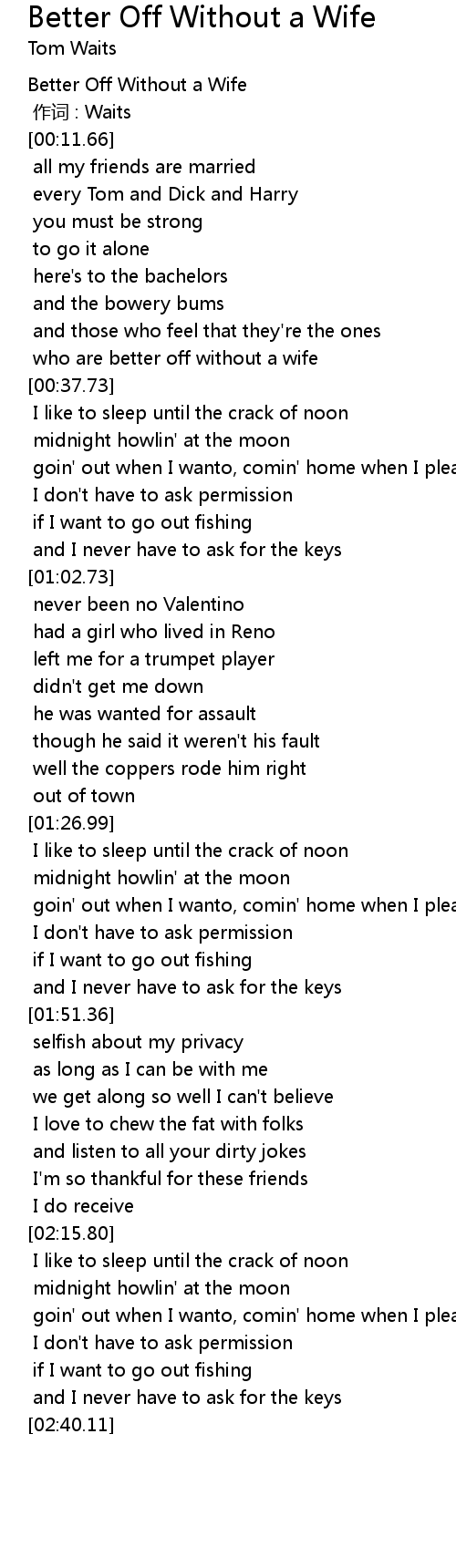 | [00:46.67] | goin' out when I wanto, comin' home when I please |