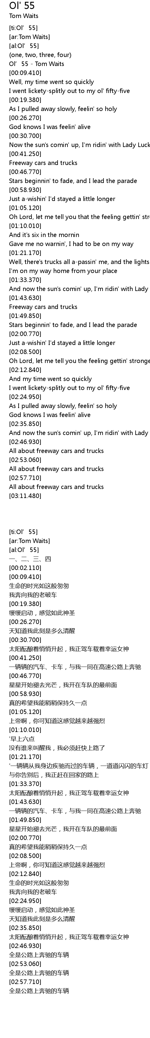 | [02:18.120] | I went lickety-splitly out to my ol' fifty-five |